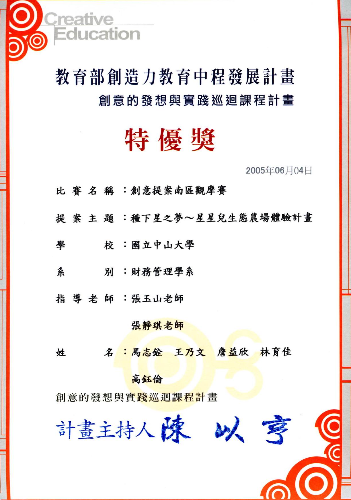 提案參加教育部「創意的發想與實踐」巡迴課程南區觀摩決賽榮獲特優(2005年12月)