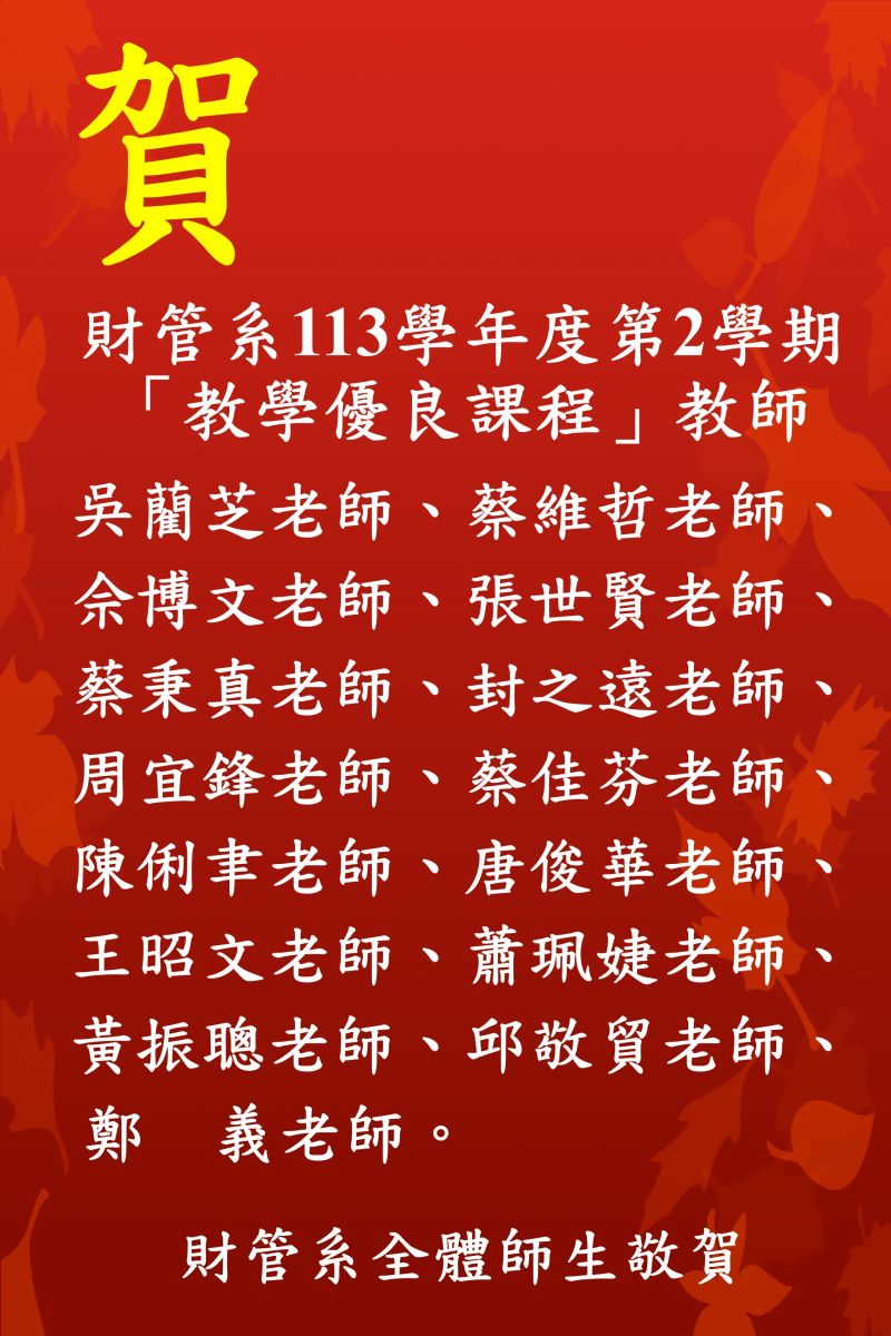 【賀】財管系教師:吳藺芝、蔡維哲、佘博文、張世賢、蔡秉真、封之遠、周宜鋒、蔡佳芬、陳俐聿、唐俊華、王昭文、蕭珮婕、黃振聰、邱敬貿、鄭義老師,獲本校113學年度第2學期「教學優良課程」獎勵。