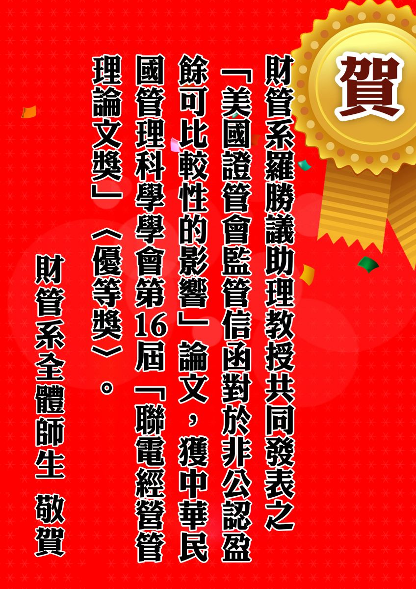 【賀】財管系羅勝議助理教授共同發表之「美國證管會監管信函對於非公認盈餘可比較性的影響」論文,獲中華民國管理科學學會第16屆「聯電經營管理論文獎」〈優等獎〉。