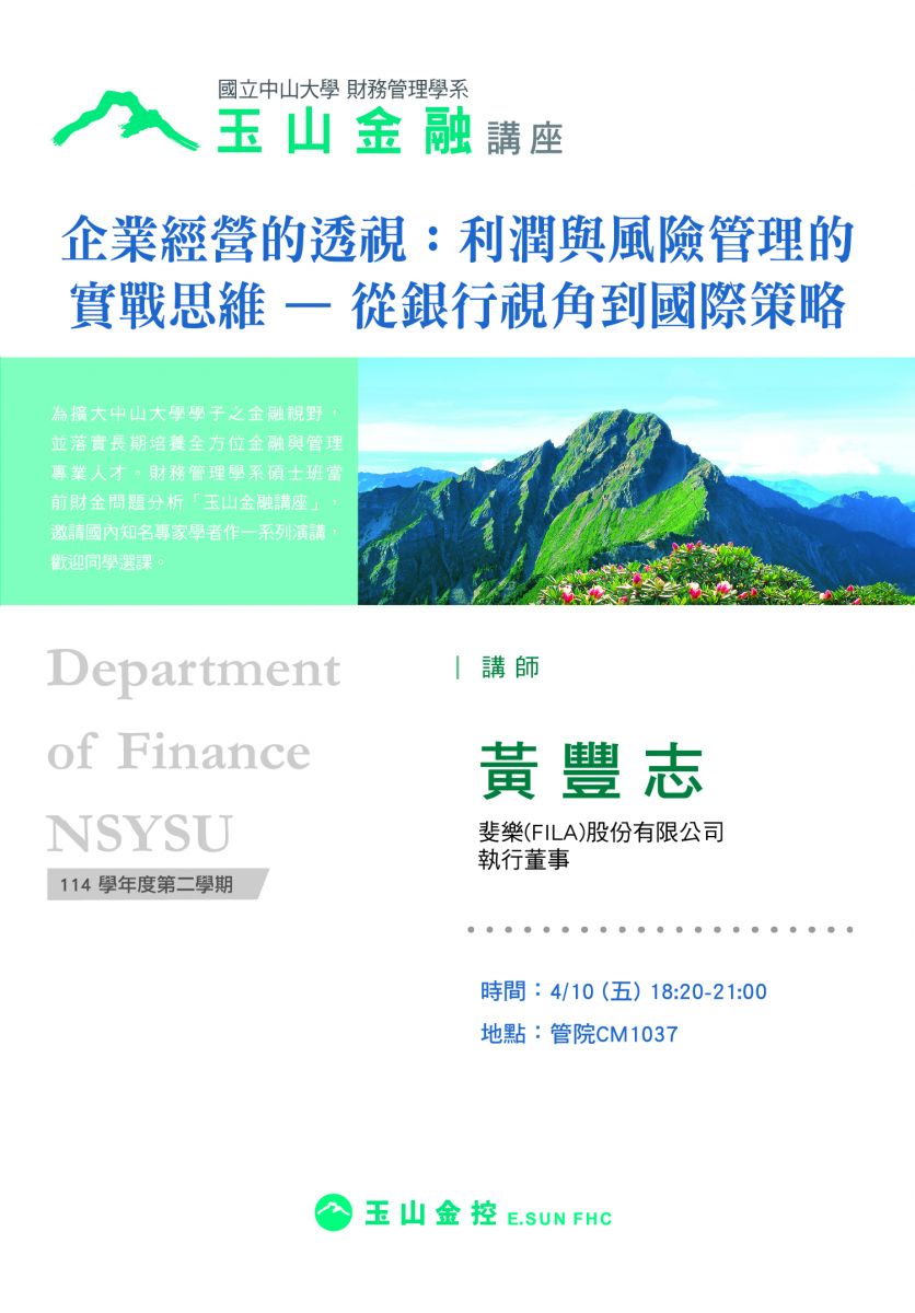 [演講公告] 115/04/10玉山金融講座(當前財金問題分析): 企業經營的透視:利潤與風險管理的實戰思維 — 從銀行視角到國際策略: 黃豐志 執行董事(斐樂(FILA)股份有限公司)